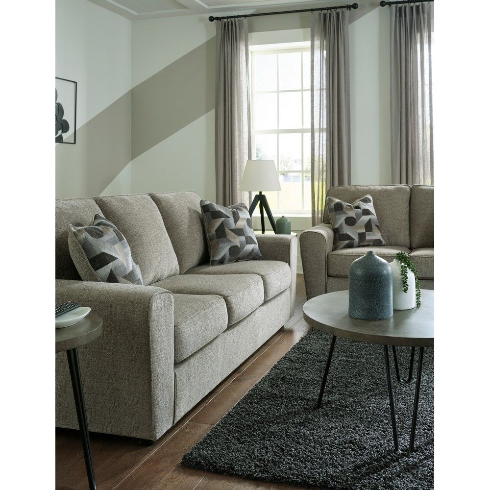 Revamp your sleekly styled living room sanctuary with this sofa. Well-suited to contemporary spaces with a calming neutral upholstery in a pewter hue, it makes a subtle design statement in your space whether you're hosting guests or enjoying a night in. Enamoring with its streamlined design, it's a simply stylish way to sink into superior comfort. Corner-blocked frame Attached back and loose seat cushions High-resiliency foam cushions wrapped in thick poly fiber Polyester upholstery Accent pillows included Pillows with soft polyfill Platform foundation system resists sagging