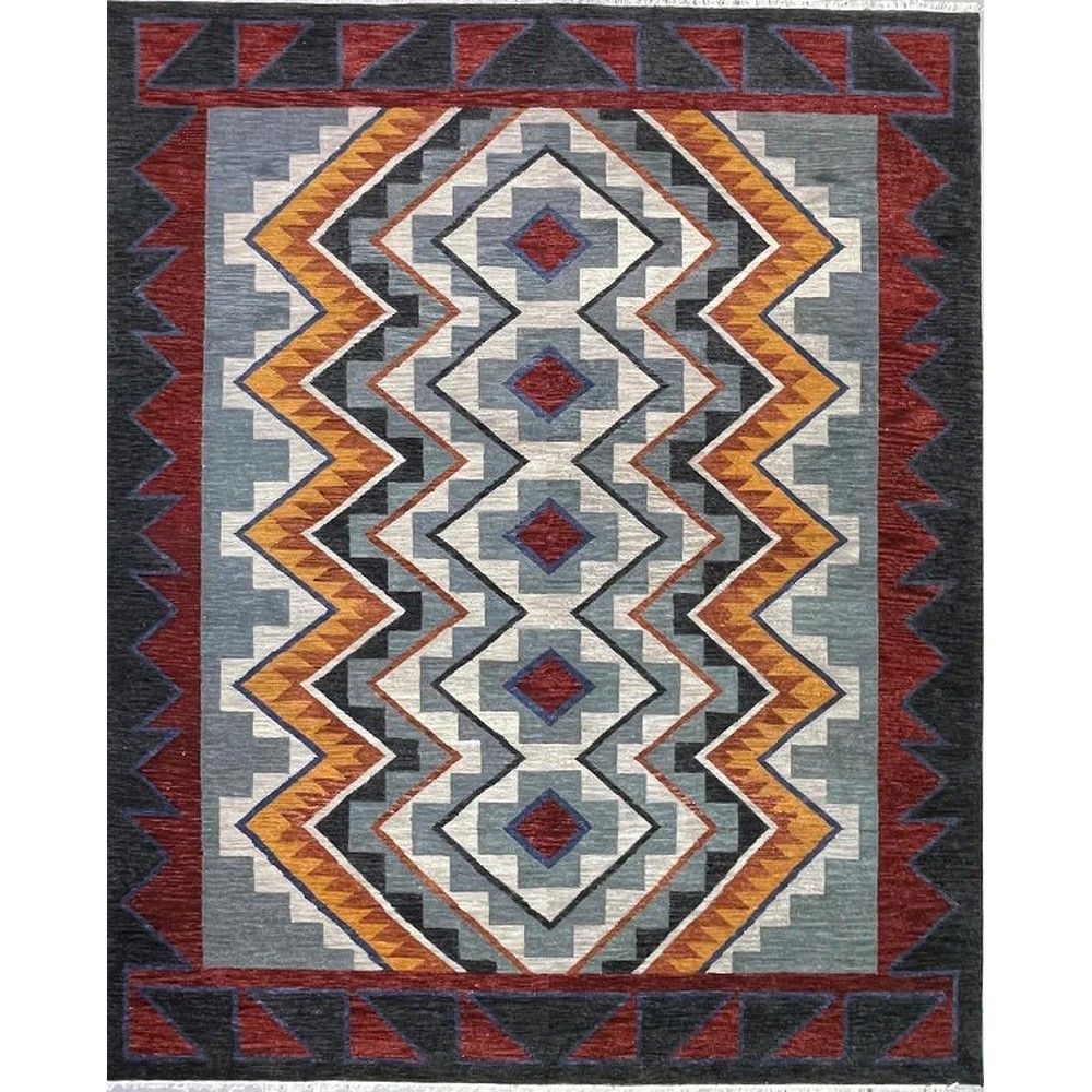 The Chief's Blanket Rug is a stunning, multi-colored rug with a dynamic central zigzag pattern. Rich tones of slate blue, burnt orange, dark red, and black converge in a design reminiscent of traditional, highly-prized textiles. This rug is a true statement piece that brings energy and artistry to your floor. The rug is 100% handwoven wool.