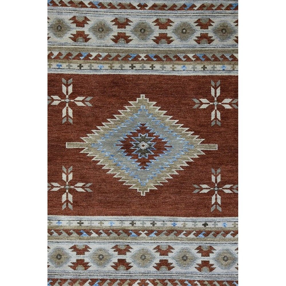 The design of the Desert Sunset Rug beautifully captures the warm glow of dusk with its dominant terracotta/rust band. A central diamond motif in soft blue and beige provides a cool contrast, while star-like flanking patterns add movement. It’s an evocative piece that brings the colors of the Western sky indoors. The rug is made of 100% handwoven wool.