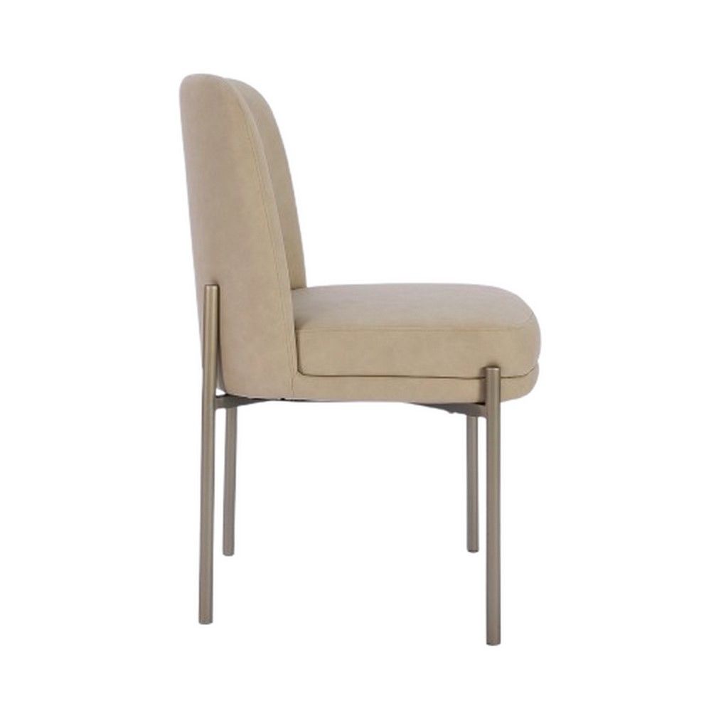 Made from synthetic leather and tubular steel Ergonomically pitched dining chair is comfortable and supportive Thoughtfully engineered seat cushion features a dense foam base layer and soft top layer for a firm, supportive feel that will soften over time Synthetic leather upholstery is made from 100% synthetic material for easy wipe-clean care Camel upholstery color is a soft tan that brings subtle earthy hues to the dining room This chair is as comfortable as it looks with an overstuffed seat cushion and one piece welded base Legs fitted with non-marking nylon glides