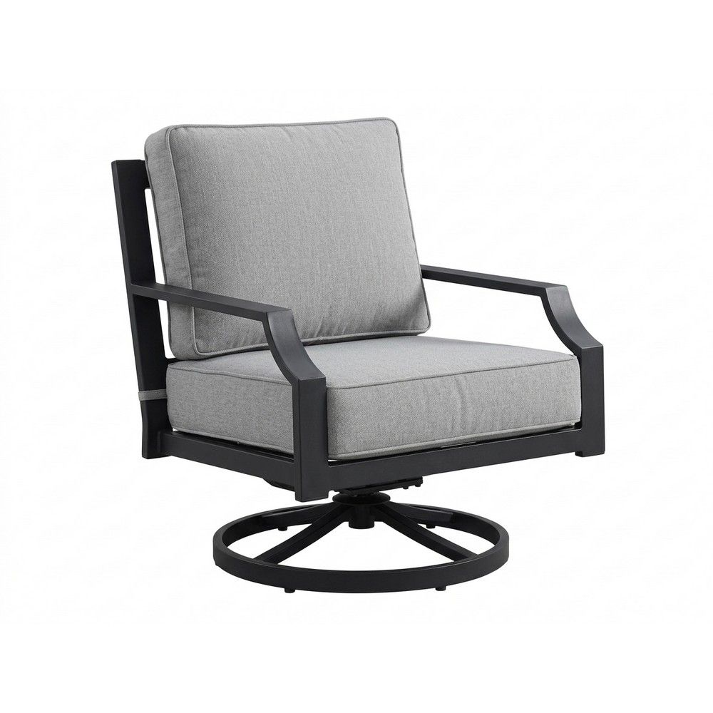 The Juneau Outdoor Swivel Lounge Chair has a fully assembled powder coated aluminum frame and comes with cushions covered in an all-weather solution dyed acrylic fabric.