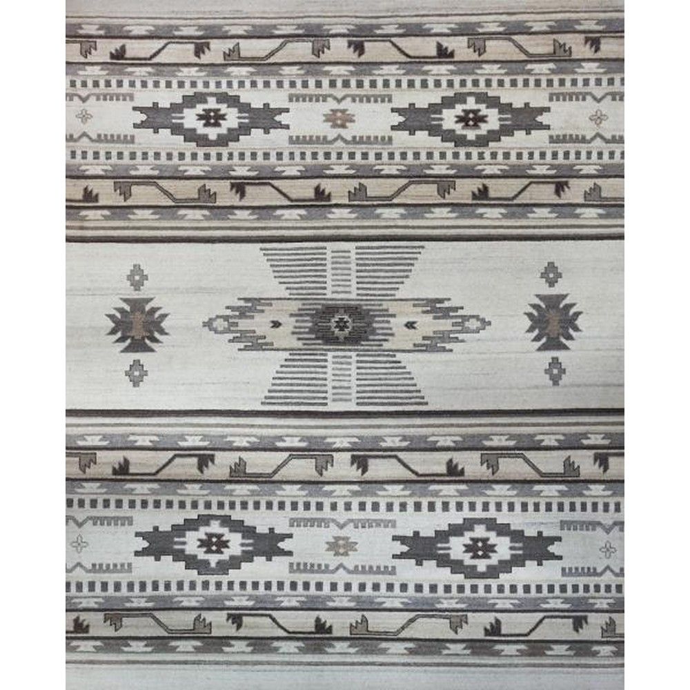 Woven in soft, earthy tones of taupe, cream, and charcoal, the Sandstone Serenity Rug captures the quiet beauty of a desert morning. Its repeating diamond and arrow motifs create a calming, balanced look perfect for a refined Western or minimalist space. The rug is made of 100% handwoven wool.