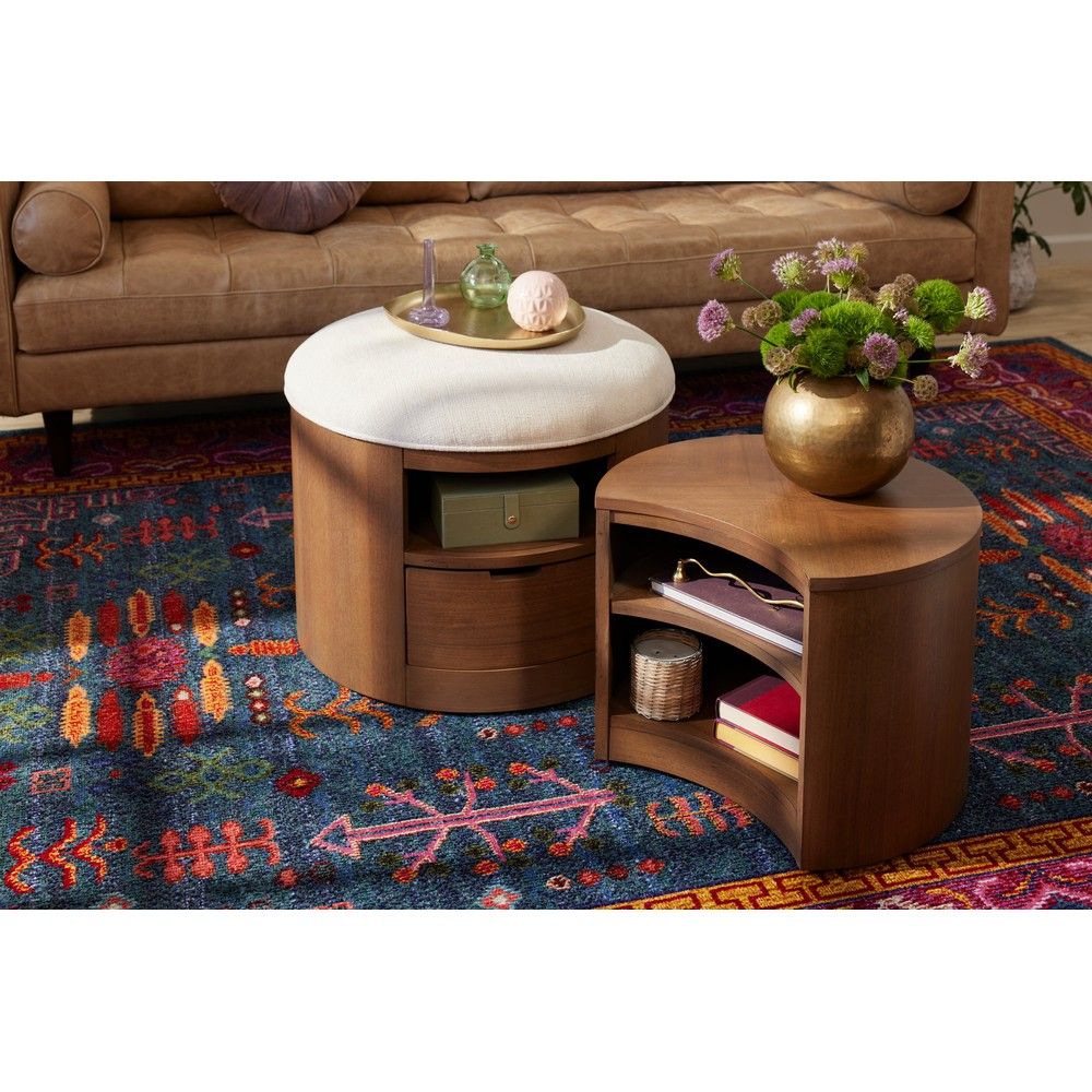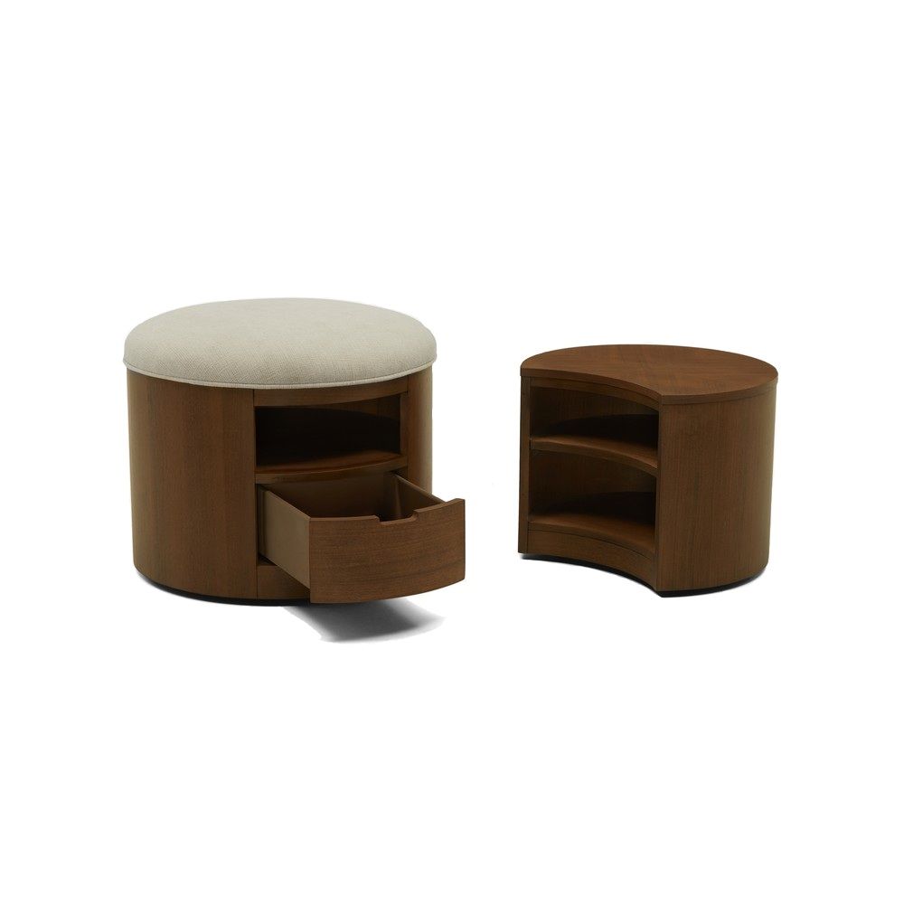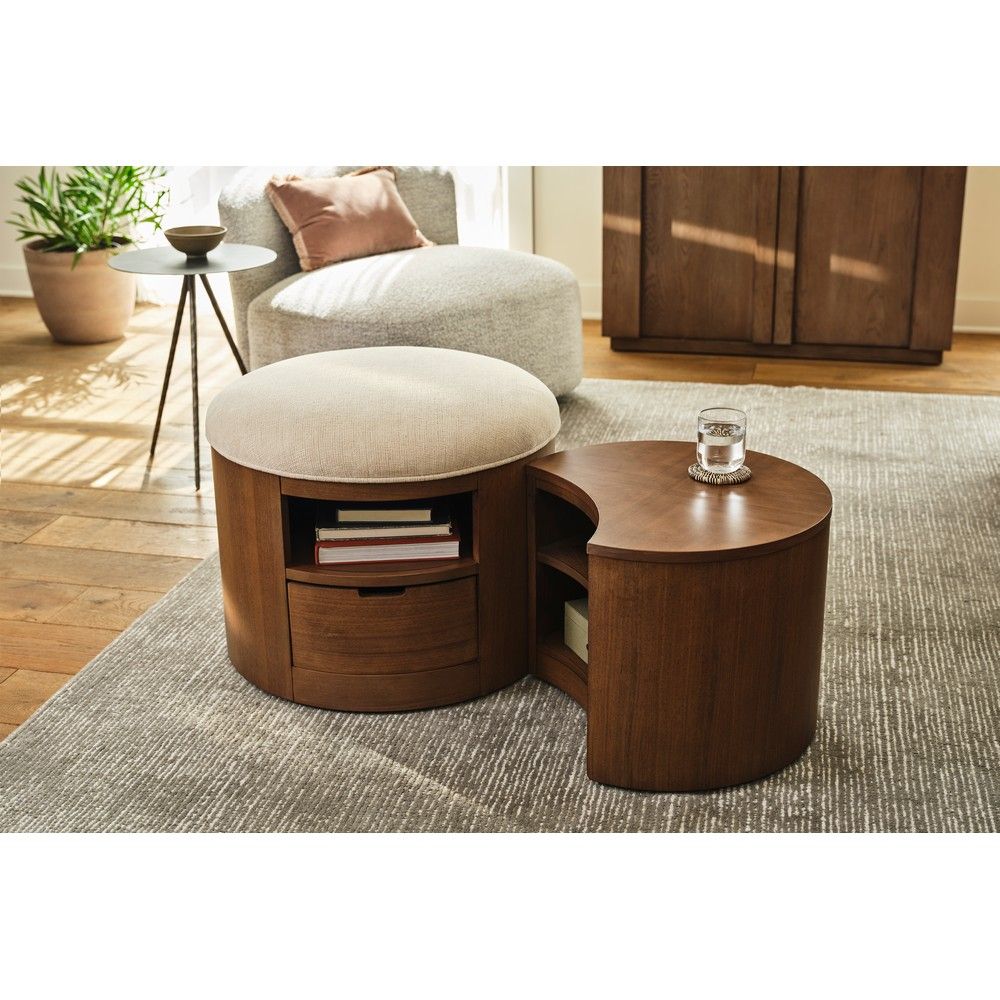 Quite the perfect pairing, the Strata combines the form of an ottoman with the functionality of a coffee table for the ultimate multifunctional piece. Perfect for smaller spaces or entry ways, this combination ottoman coffee table gives you a cozy seat or a place to prop up your feet with a concealed shelf and drawer to help keep things organized. Walnut and select solids Some engineered wood Medium Brown Finish